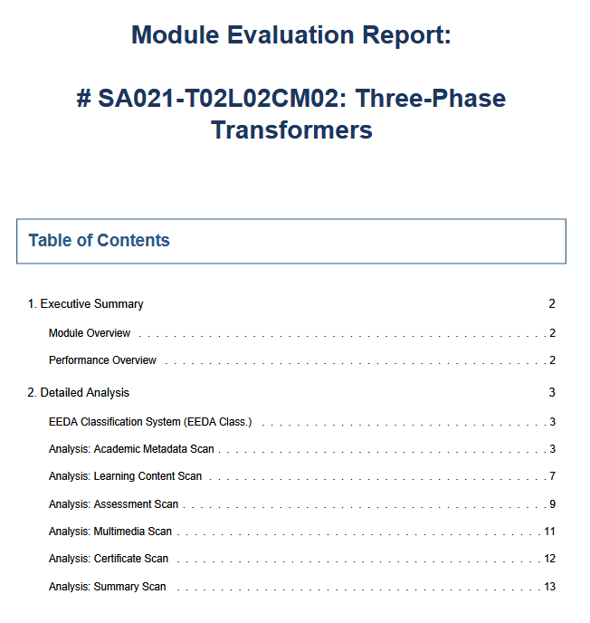 In addition, we have been testing the review of modules created in Learnify using the AI review tool currently under development. This tool is designed to support educational content creators working with the platform by providing structured feedback and suggestions for improvement. The report generated by the AI review is organized into different sections, which break down the areas that require enhancement.